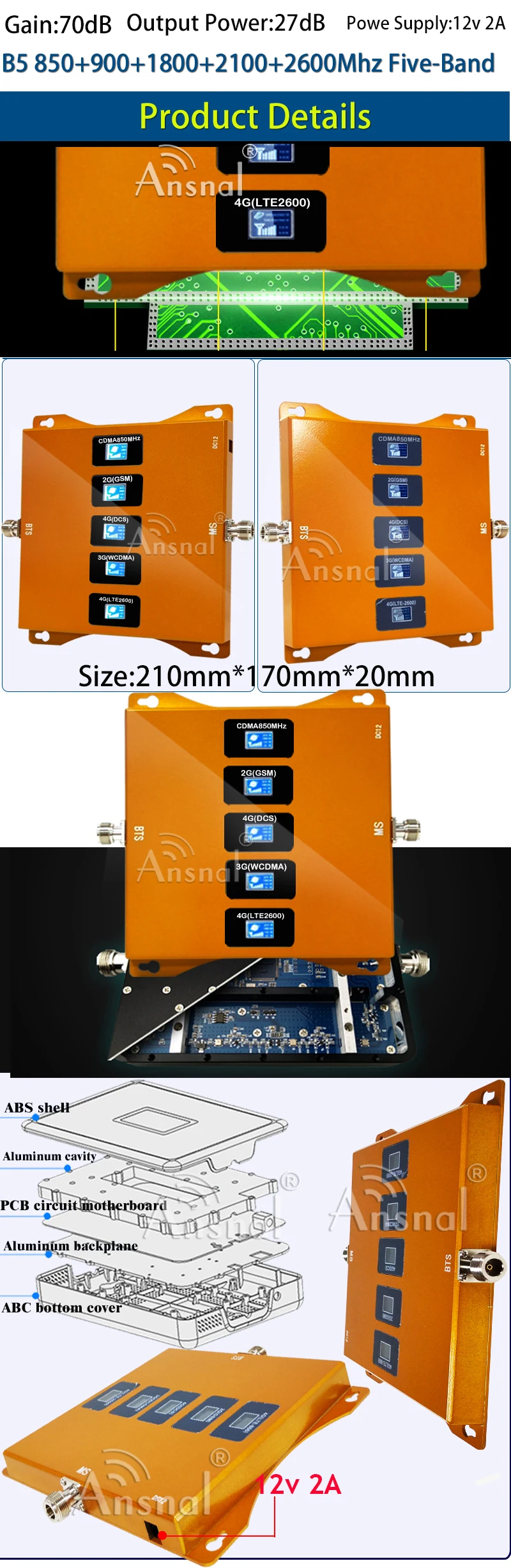 Новое обновление в 2020 году, пятиполосный Band5 850 900 1800 2100 2600 МГц мобильный сотовый усилитель