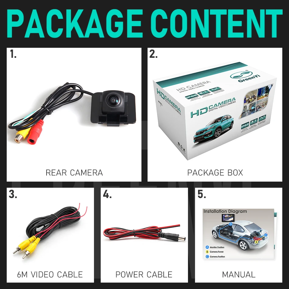 • Не требуются интерфейсы CANBUS или OBD, встроенный модуль реверсивных треков камеры, просто подключите питание.