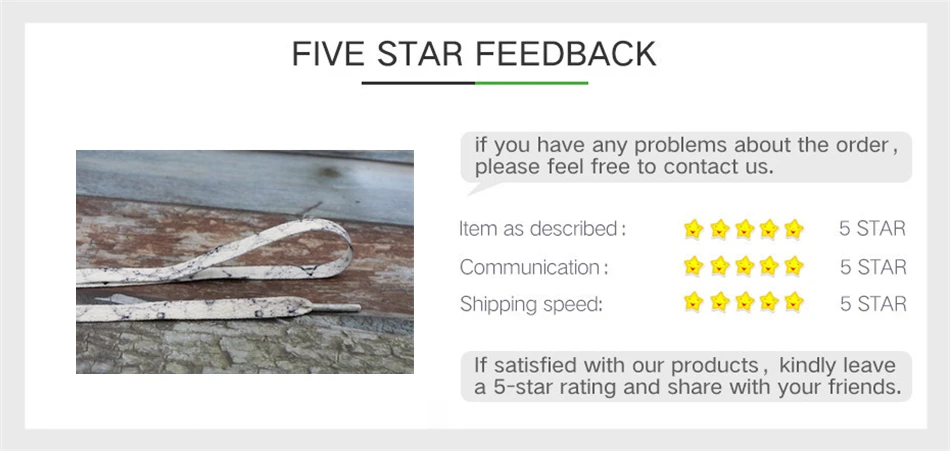 1. Пожалуйста, укажите свое полное имя в адресе доставки и убедитесь, что вы выбрали правильный адрес доставки и почтовый индекс. Если вы этого не сделаете, вы не сможете получить свои посылки. 2. В зависимости от персонального монитора компьютера может быть Хроматическая аберрация, что является нормальным явлением. 3. Шнурки имеют погрешность в длине, диапазон погрешности составляет около 1-3 см. 4. Если вы хотите купить несколько советов для ваших шнурков, мы можем установить для вас бесплатно.
