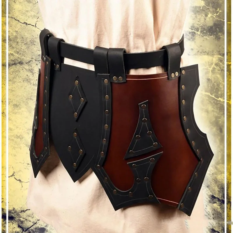 -Medieval tassets, with belt. -Material:PU leather. -Perfect for ancient roman, medieval gladiator, berserker or warrior outfit. -Package include: Tassets + Belt.