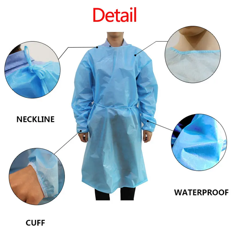 Specifications: Name: Protective Gown Material: Non-woven fabric,and PP Size(about): 140cm for bust,120cm for length Color: blue Size: free size (suitable for most people) Suitable for: home, outdoor, cycling, camping and other environments Packing List: 10 x Disposable Protective Gown