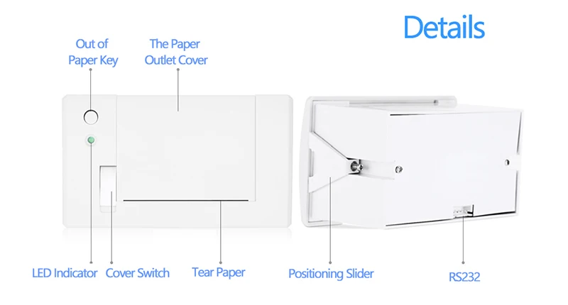-Красивый внешний вид с мини-формой, практичный и удобный-Простая Бумажная структура и замена бумажного корпуса с передней панели, простота в эксплуатации-малошумная термопечать, Не беспокойтесь о других, создайте спокойную среду-дополнительные различные интерфейсы-очень легко вставлять в различные инструменты-поддерживает набор инструкций по печати ESC/POS