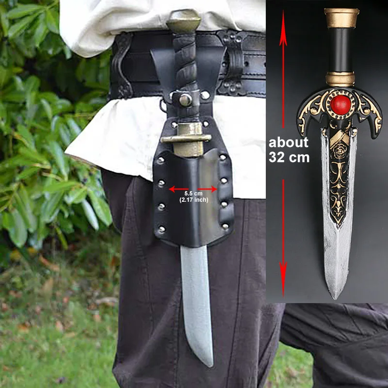 -Scabbard material: PU leather. -The sword material: Polyurethane. -The scabbard can hold a vast range of daggers securely. -Perfect for larp, theater and cosplay outfit. -Scabbard and sword need to be paid separately. -"Scabbard" package include: one piece scabbard. -"Dagger" package include: one piece dagger.