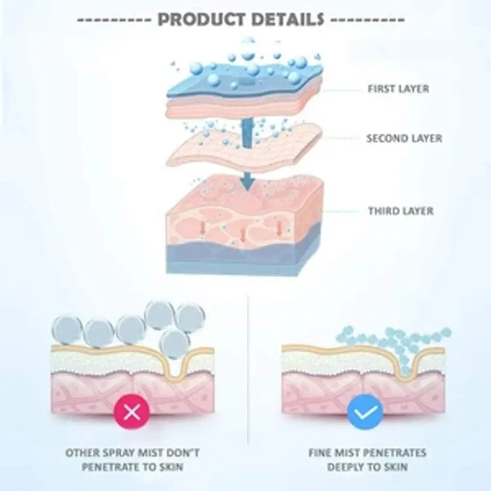 5. Множество преимуществ: глубокое увлажнение, уменьшение тонких линий, эффективное улучшение кожи. Нанотехнология распыления, слой за слоем проникновения. Отличный дизайн, прозрачная бутылка и жидкая кромка четко видны. Материал ABS, силикон, безвредный и экологичный.