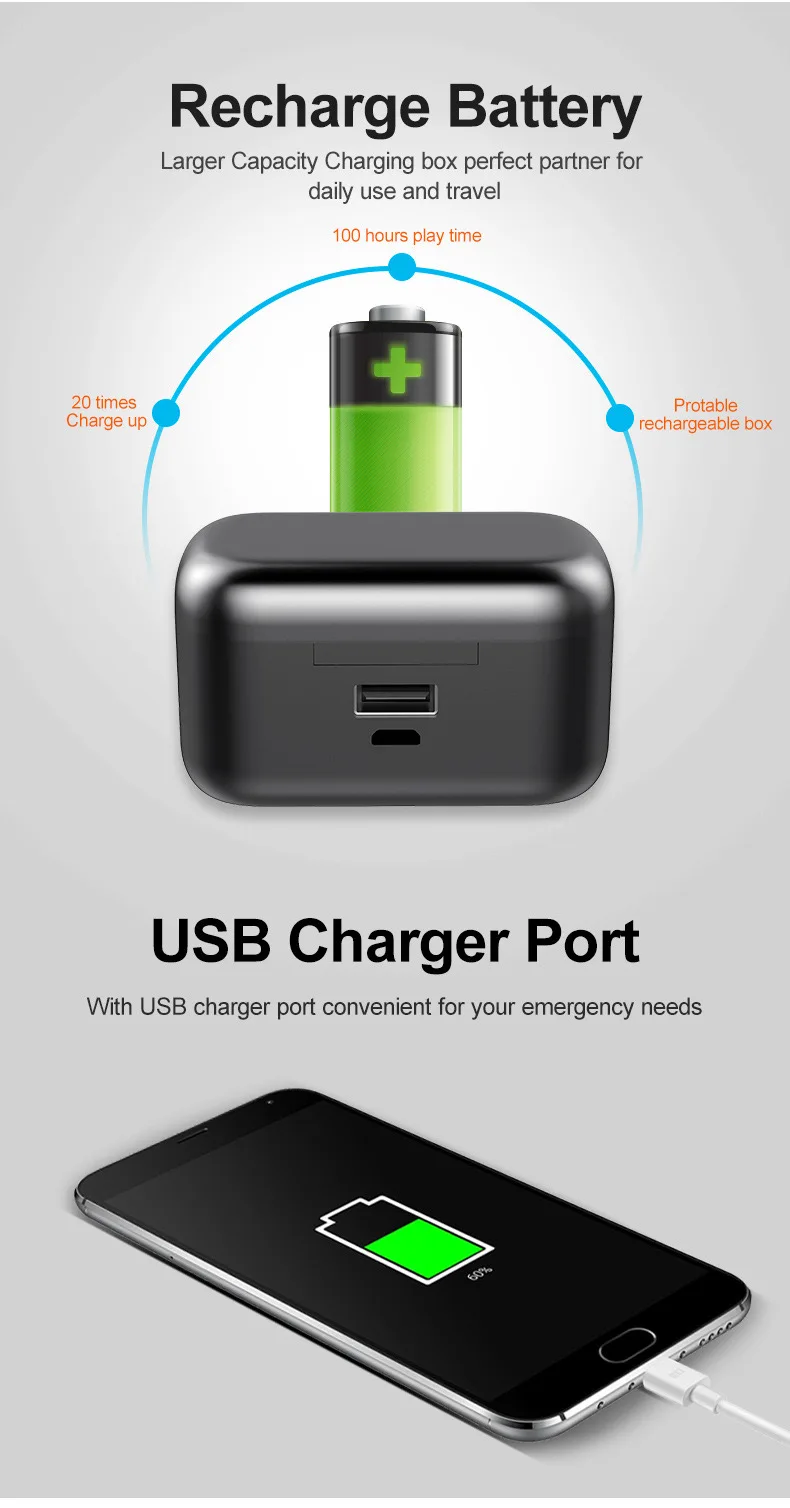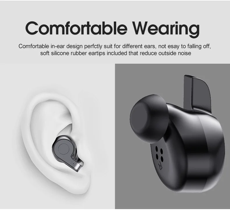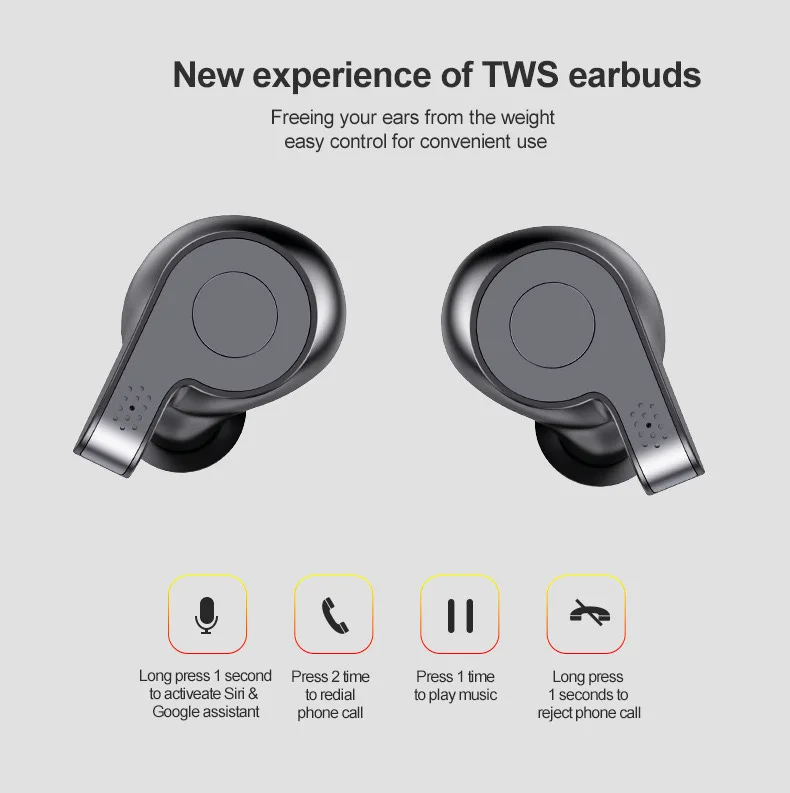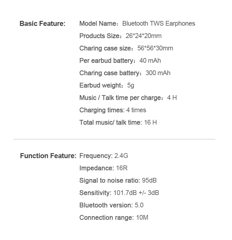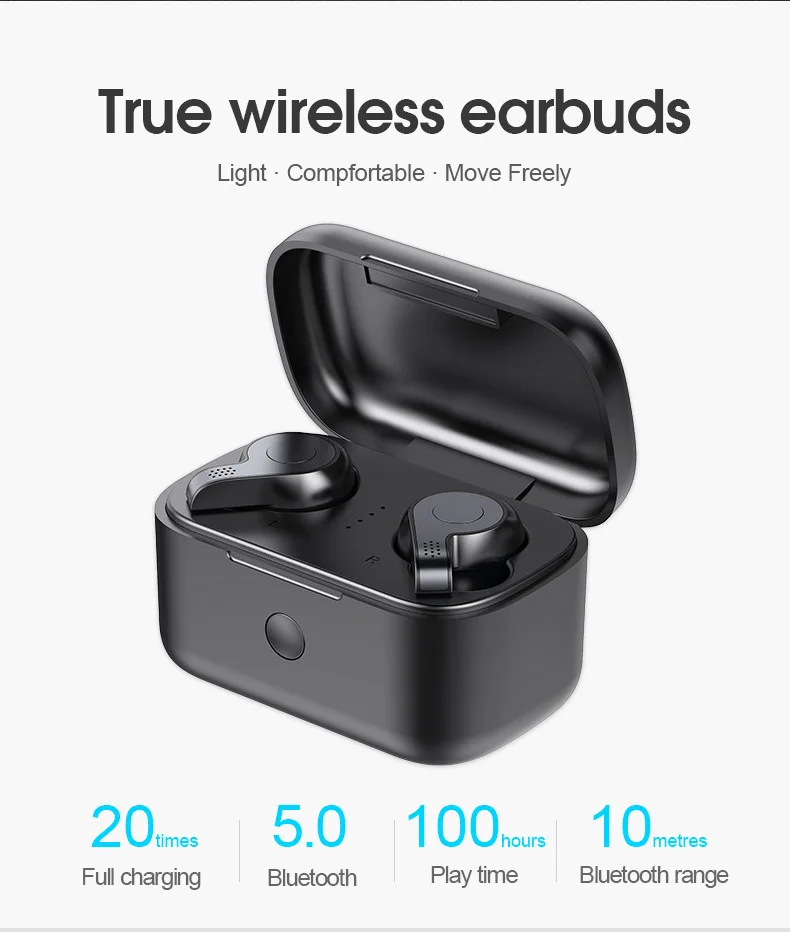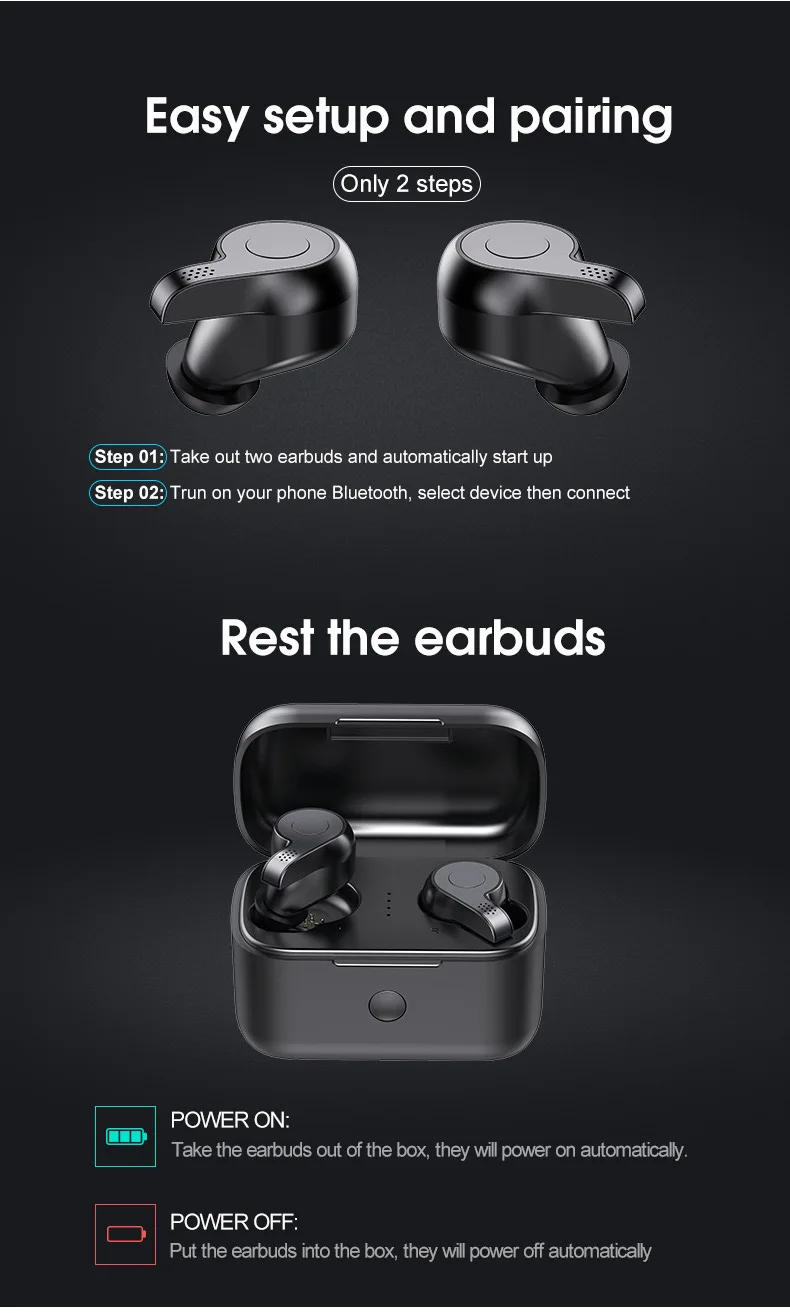 Продукт Особенности: 1, Bluetooth V5.0, Поддержка большинства устройств bluetooth с более низким энергопотреблением 2, с водонепроницаемой технологией, больше не нужно беспокоиться о воде и поте 3, 8MMS двойной привод, наслаждайтесь 9D сильным глубоким басом и музыкальным звуком 4, популярная функция сенсорного управления, поддержка коммутационных песен, телефонных звонков и голосовых вызовов. Аксессуары для списка: 2 * Bluetooth наушники 1 * зарядный чехол 1 * USB кабель 1 * Руководство пользователя 3 * чашки для наушников (размер L,M S)