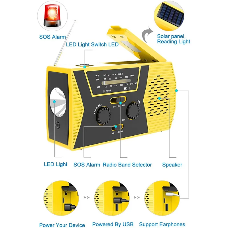 [Crank radio charging power bank] Это ветряное радио работает как аварийное мобильное зарядное устройство с встроенным стандартным выходным портом USB 5 в постоянного тока для зарядки мобильных устройств, таких как смартфоны, GPS, MP3-плееры, цифровые камеры и т. Д. Другие функции включают 5-светодиодную лампу для чтения, светодиодный фонарик и красный светодиод S. О. S. Светильник маяка.