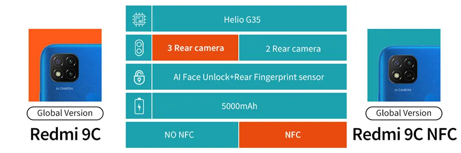 Redmi 9C13MP AI задняя камера | 6,53 "HD + DotDrop дисплей | 5000mAh аккумулятор высокой емкости | Мощный процессор Helio G35* Примечание: Ниже представлено изображение Redmi 9C без NFC версии.