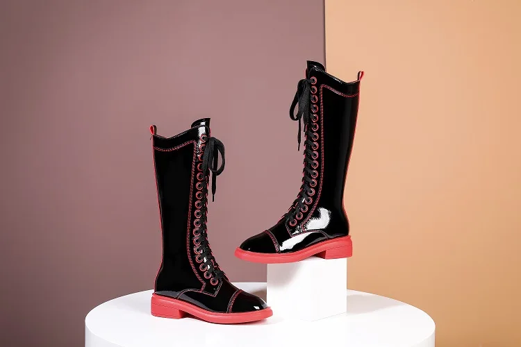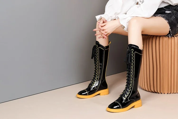 Отзывы о Женские лакированные кожаные сапоги зимние длинные до колена с перекрестной
