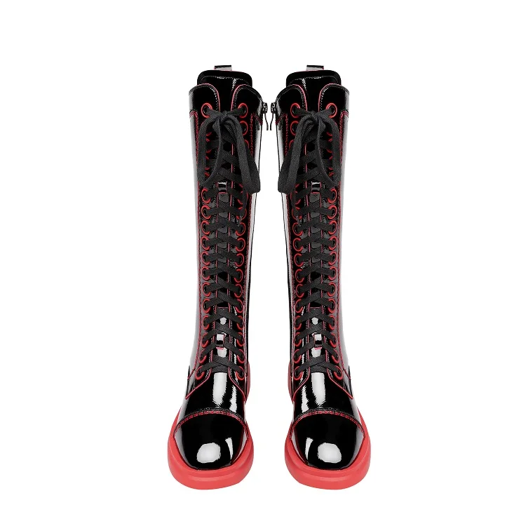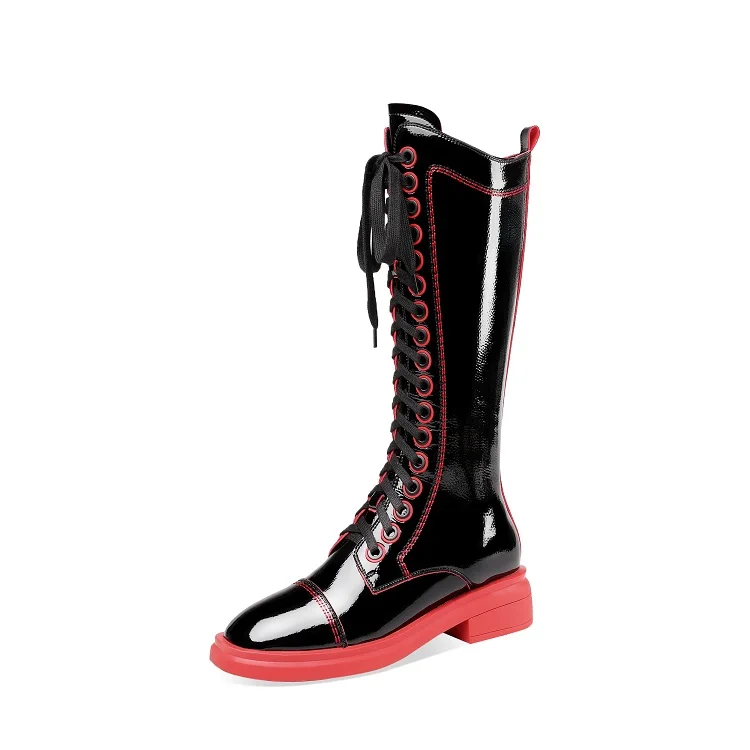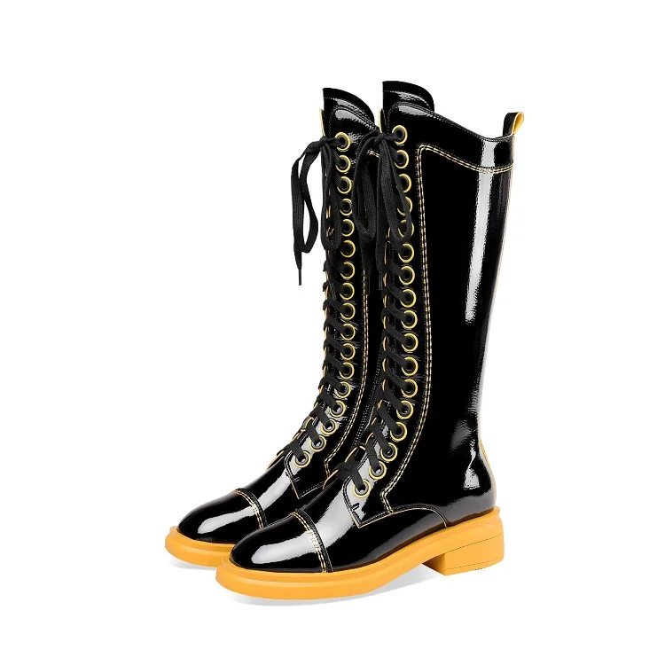 Женские лакированные кожаные сапоги зимние длинные до колена с перекрестной - купить