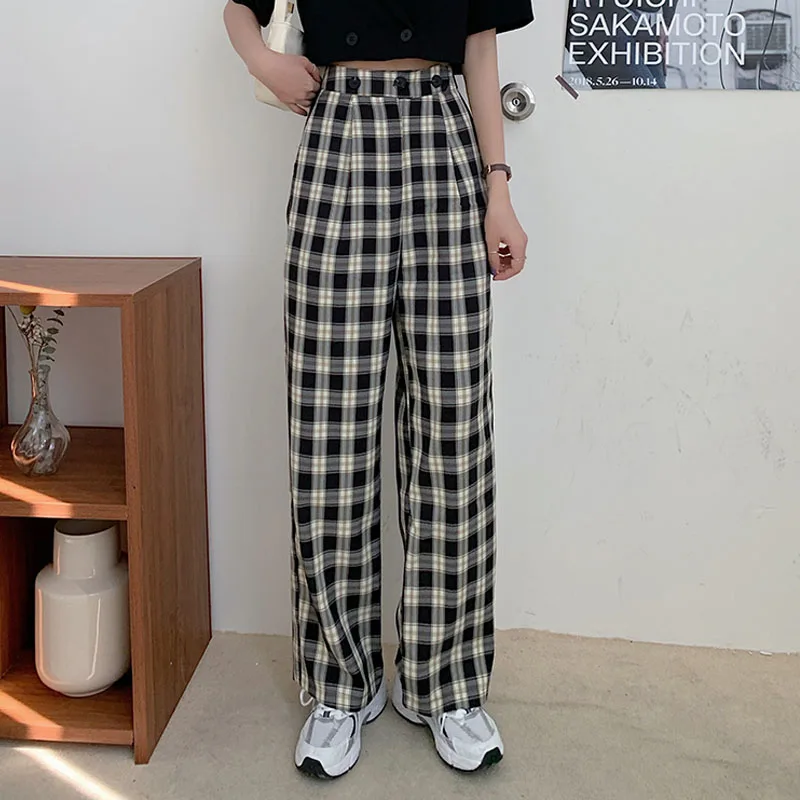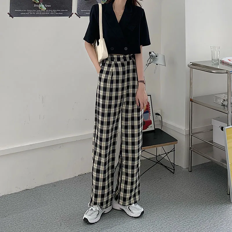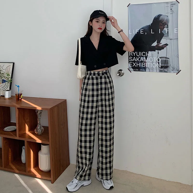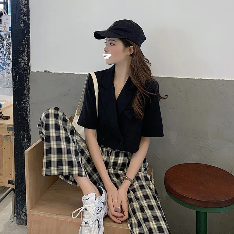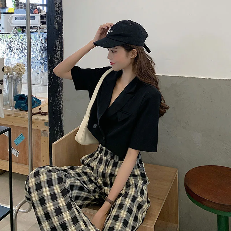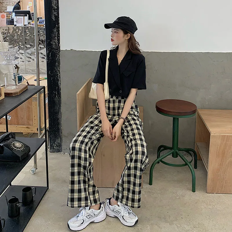 2020 новые корейские модные топы, повседневные штаны, комплект из двух предметов, Сексуальные облегающие Короткие топы с v-образным вырезом + повседневные свободные штаны в клетку, комплект из двух предметов