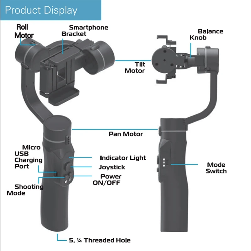 [Долгосрочное использование] разработан со стандартным usb-портом, стабилизатор Gimbal может заряжать с помощью вашего собственного зарядного кабеля. Компактно построенный с микро-встроенной батареей 2200mAh, энергосберегающий и прочный