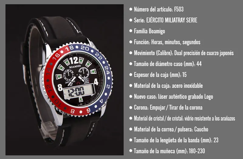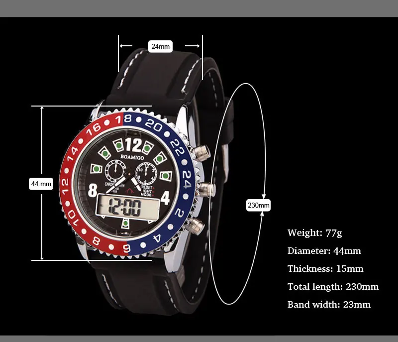 -Параметры Материал корпуса: сплав Диаметр корпуса: 4,4 см Толщина корпуса: 1,5 см Материал ремешка: Резина Длина ремешка: 23 см Группа Ширина: 2,4 см Вес часов: 101 г -Комплект поставки: 100% новые часы * 1 -Способ продажи: Прямая поставка, опт, розница