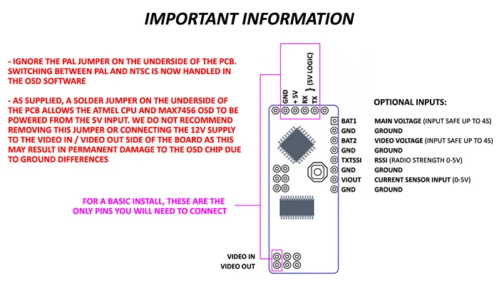 MinimOSD поставляется предварительно запрограммирован с мульти Wii OSD. Он отличается от многих других моделей MinimOSD на рынке, имея дополнительные входные контакты, чтобы информация, такая как напряжение батареи и данные RSSI, отображалась непосредственно на OSD (см. Ниже). Его основные компоненты-это ATmega328P 8-битный микроконтроллер с загрузчик ардуино и MAX7456 монохромный Отображение на экране. Программирование осуществляется через кабель FTDI с помощью программного обеспечения arduino. При перепрограммировании OSD также может использоваться для контроллера полета APM или CC3D.