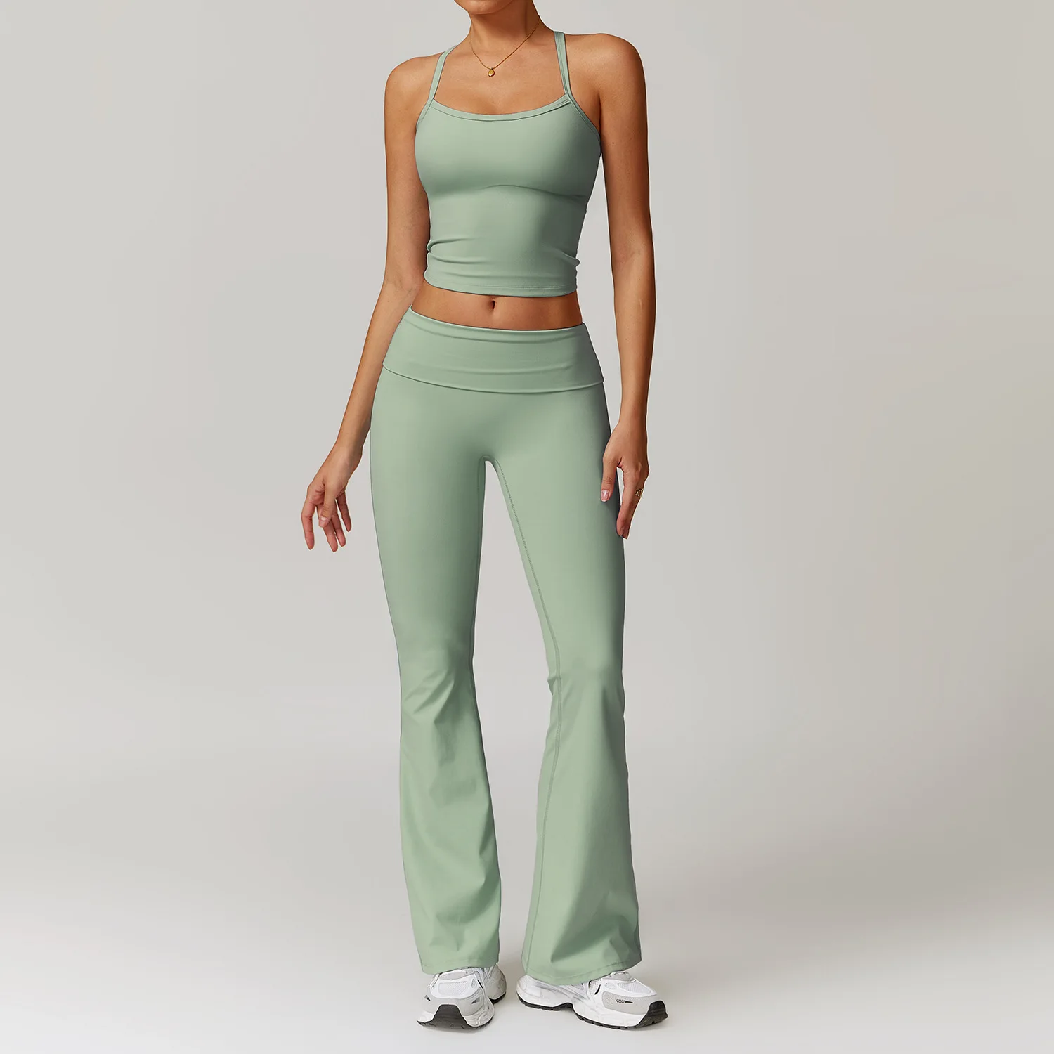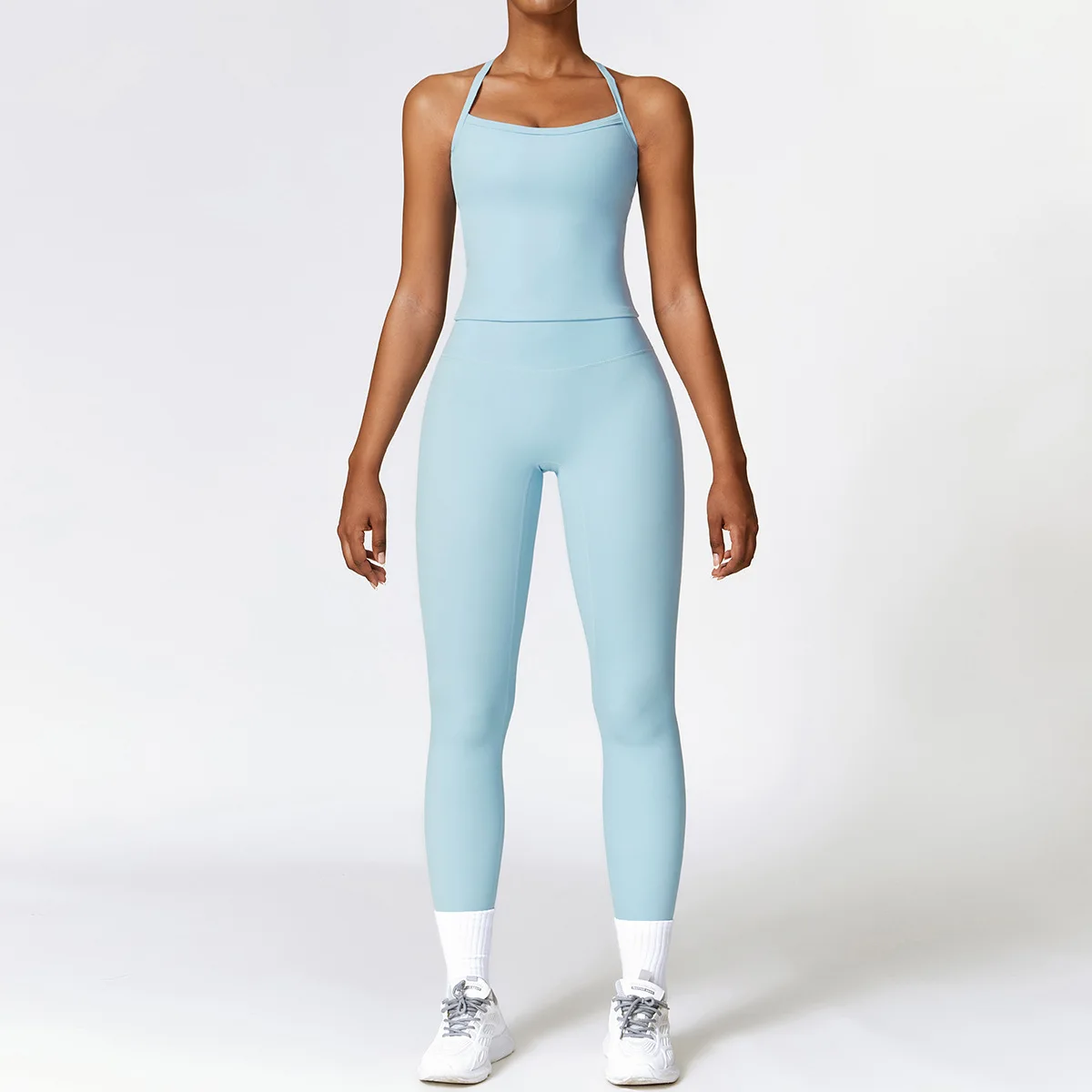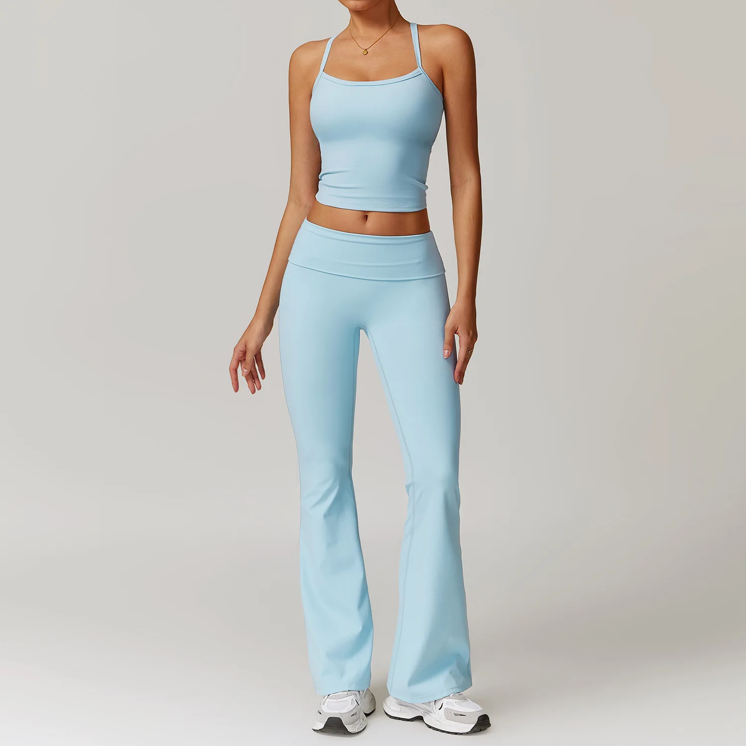 Отзывы о 2-х предметный комплект для йоги женский спортивный костюм с лямкой на шее укороченный топ расклешенные леггинсы высокой талией фитнеса одежда тренировок в тренажерном зале пуш-ап