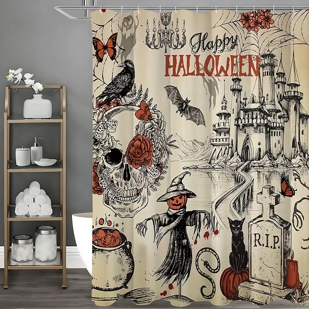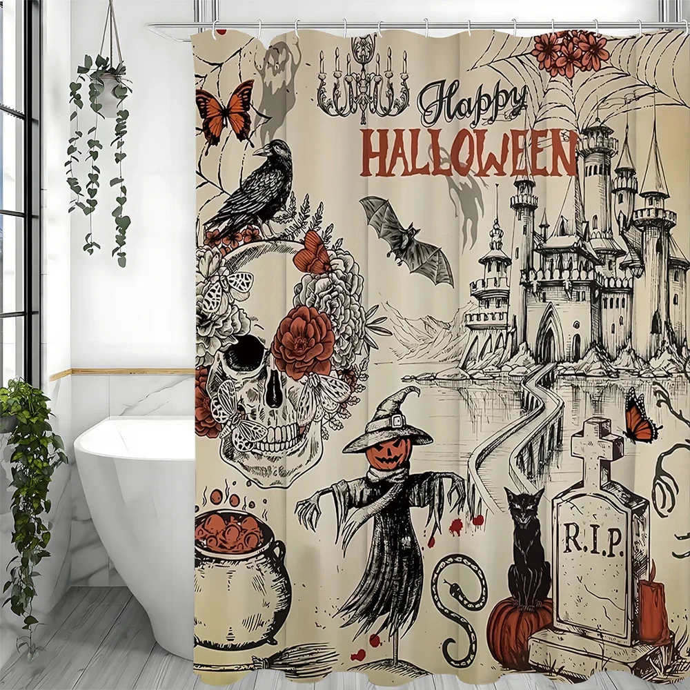 Отзывы о Винтажный замок с черепом на Хэллоуин могильный готический череп летучая мышь ворон черный кот занавеска для душа декоративная ванной комнаты Waterp