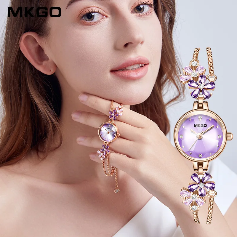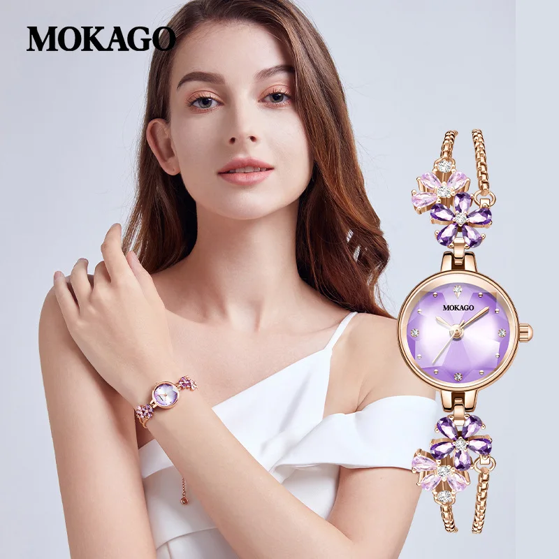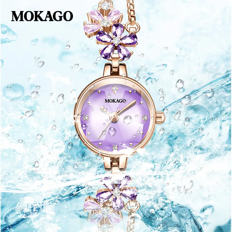 Отзывы о MOKAGO 8109 медный циркониевый ремешок расшитый бриллиантами солнечный узор фиолетовый циферблат цветок часы для женщин с регулируемым браслетом