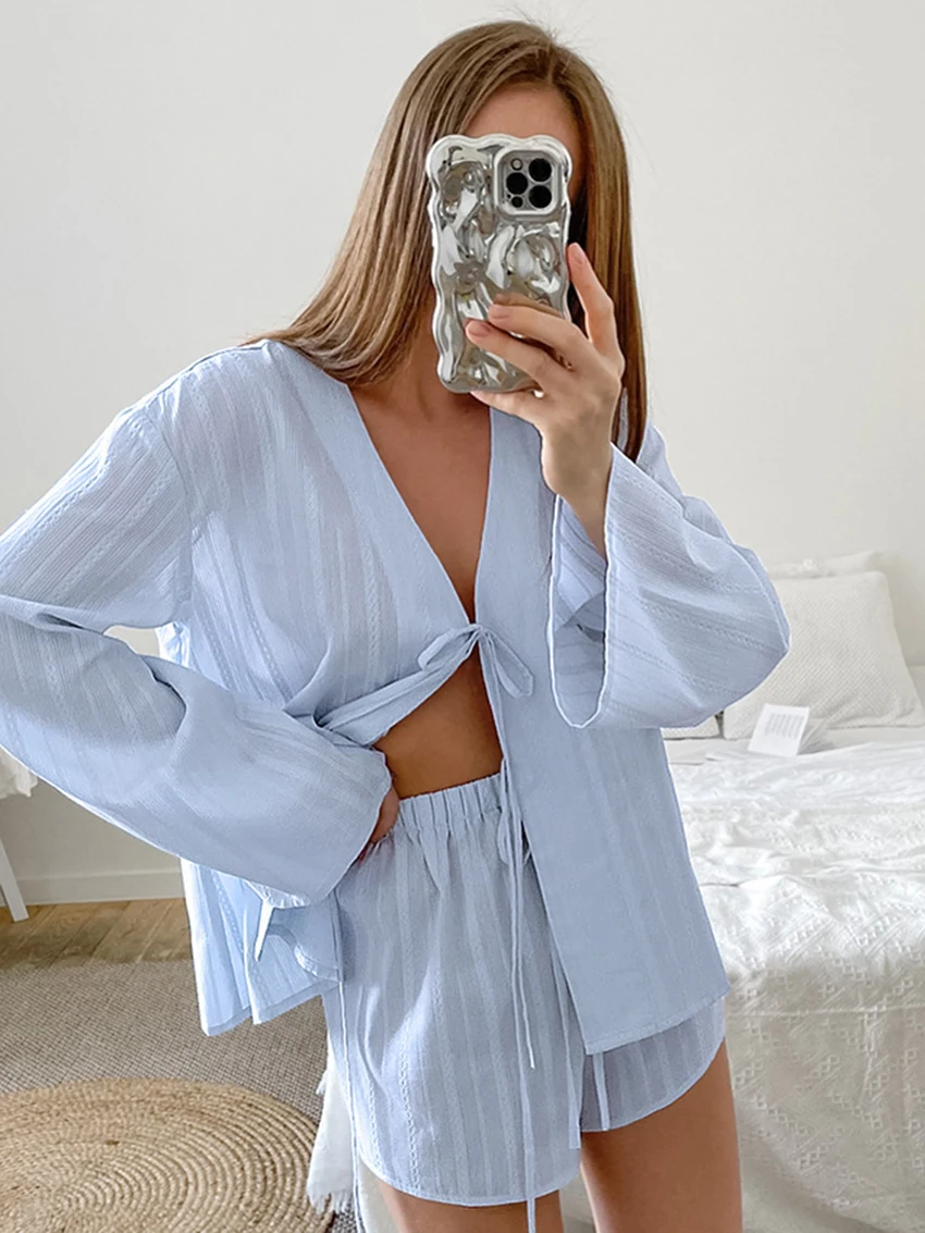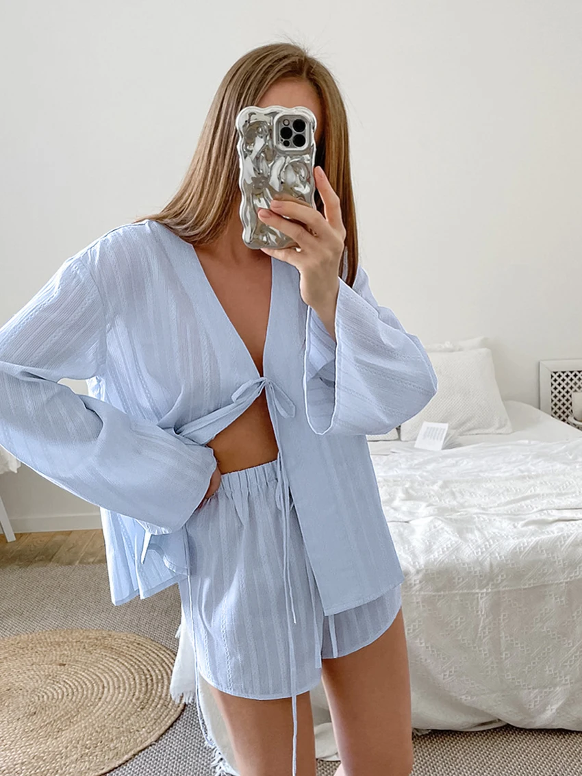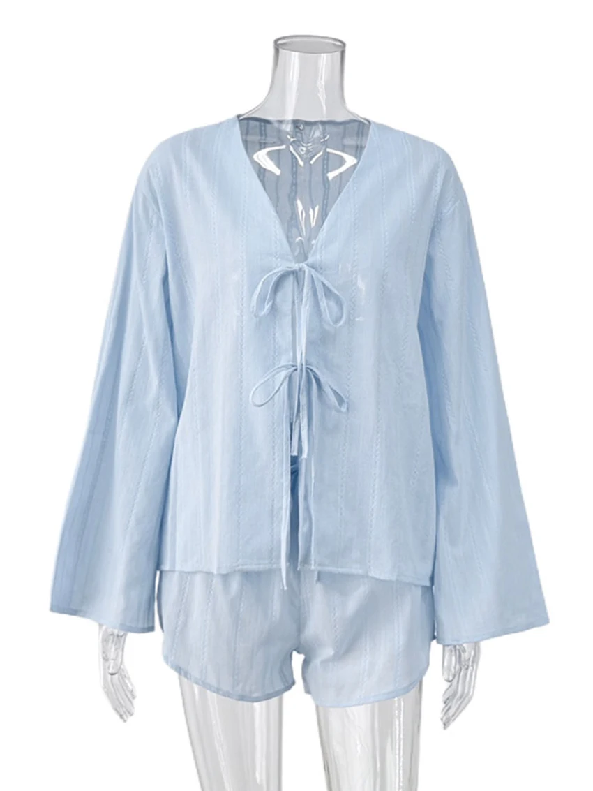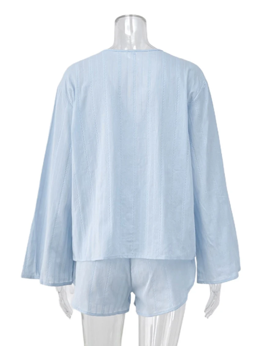 Отзывы о Parc Fee повседневный свободный синий хлопковый домашний комплект из 2 предметов для женщин элегантная рубашка с длинным рукавом 2025 года и шорты высокой талией женский