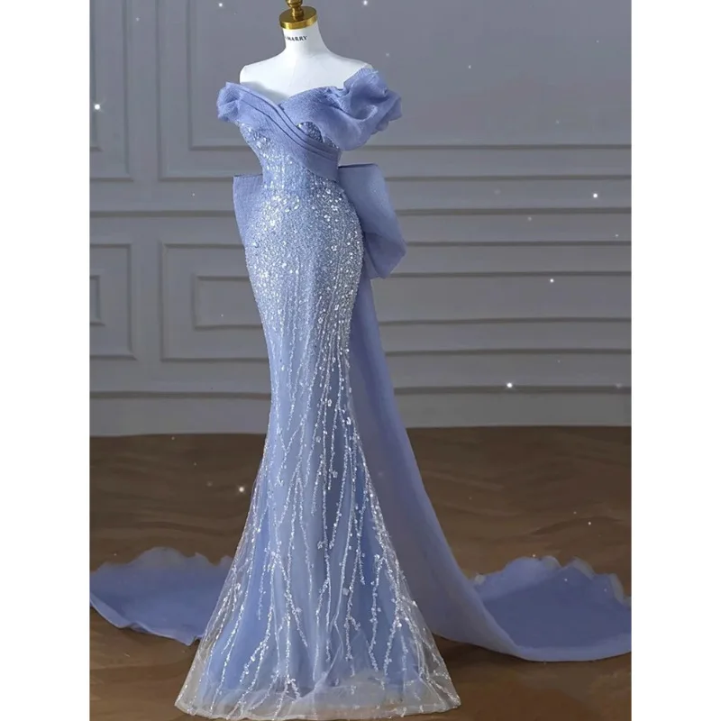 Отзывы о Женское платье высокое синее вечернее с открытыми плечами легкое роскошное нишевое элегантное пайетками и русалкой