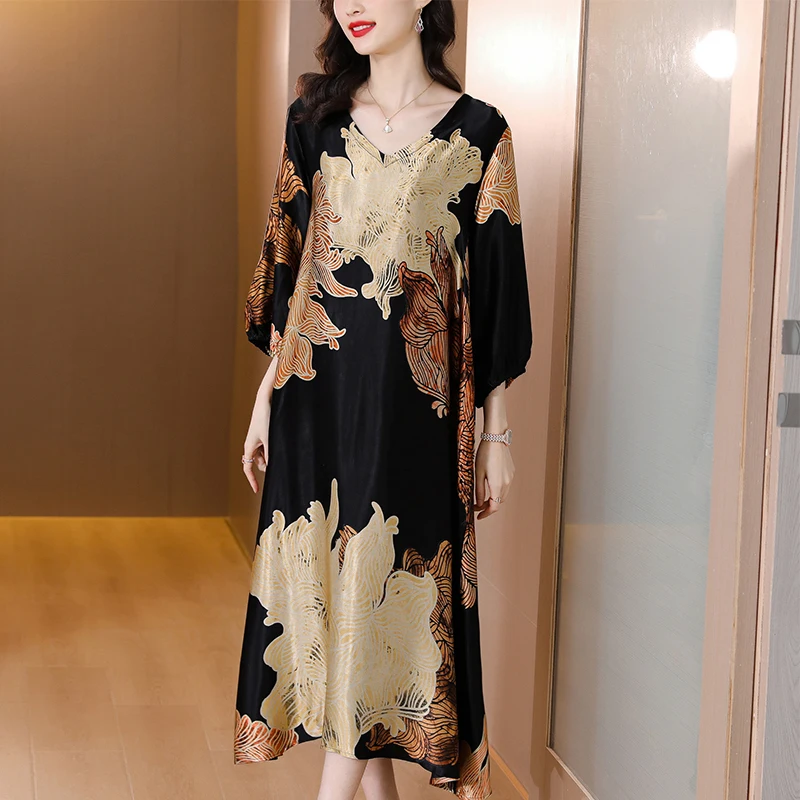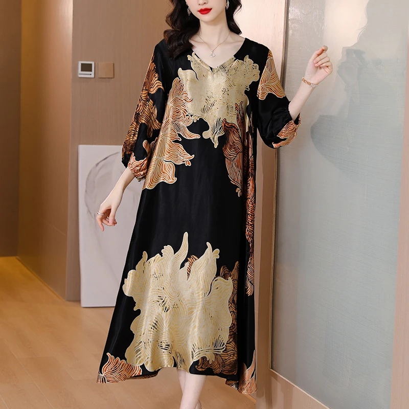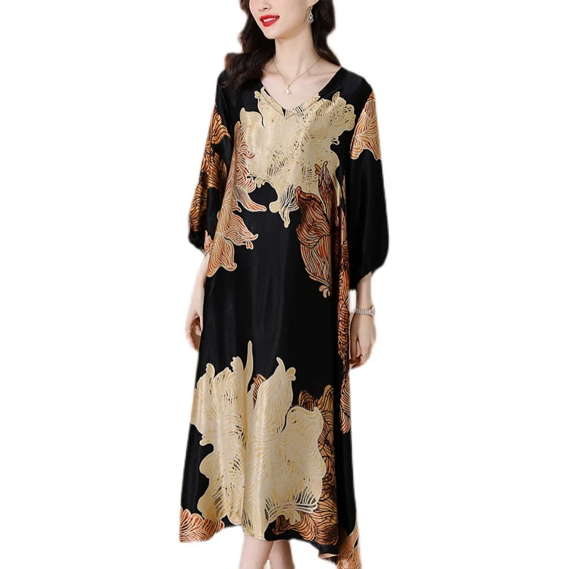 Отзывы о Женское платье миди из натурального искусственного шелка с v-образным вырезом и цветочным принтом весна-осень элегантное свободное больших размеров корейское винтажное повседневное XQ299