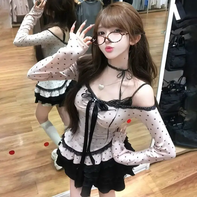 Отзывы о Женский комплект из двух предметов в японском стиле Sweet High Street Y2K топы горошек с бантом + кружевное слегка эластичное платье шикарный праздничный