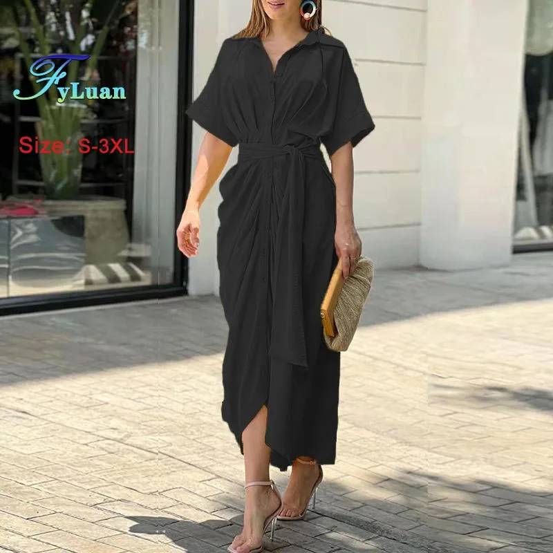 Отзывы о 2023 летнее новое женское платье модное средней длины с отложным воротником однобортное платье-рубашка высокой талией повседневная женская одежда
