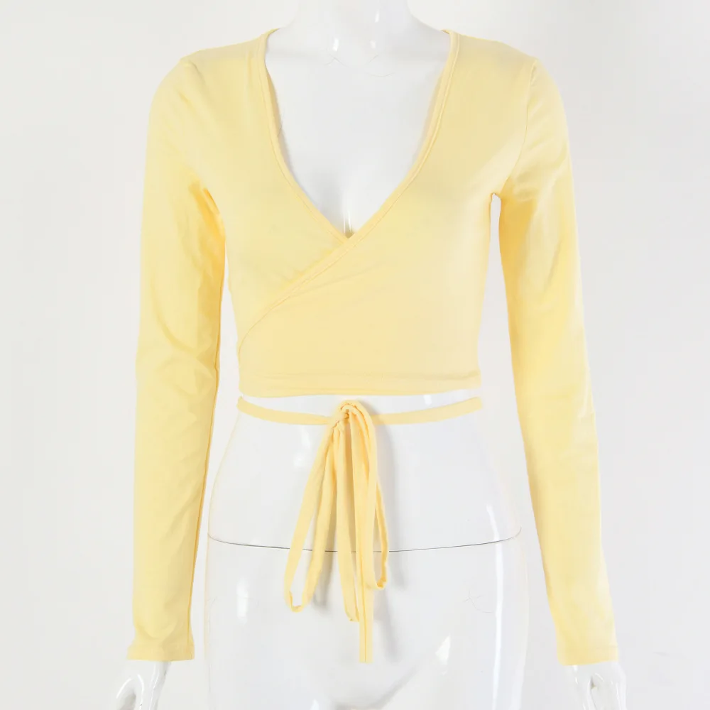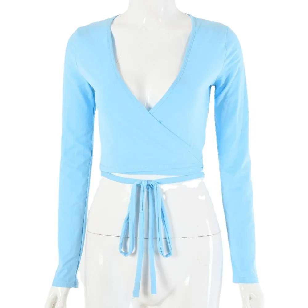 Отзывы о Женская летняя одежда футболка из чистого хлопка сексуальный однотонный короткий топ с глубоким v-образным вырезом и завязками длинными рукавами
