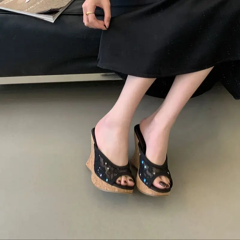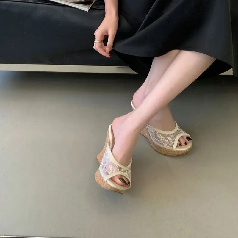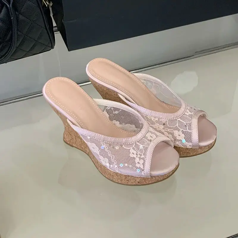 Отзывы о Розовые босоножки на танкетке с белым кружевом платформа 10 см женские туфли высоком каблуке шлепанцы сандалии новинка 2026 года